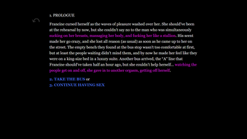 Imagine an impossible, far-away, parallel world where people always act on their most animalistic sexual urges. Now imagine that this is not just acceptable, but the basic norm for the whole of human society. It's a world where asking for fellatio is as common and uneventful as asking for the time. Where sleeping with your boss and coworkers is not a big deal. Where going out to eat usually involves eating out someone across the table, and where concerts routinely end in mass orgies. Well, you don't actually have to imagine such a world, you can be an active participant in it. Guide our heroes, Marlene & Jonathan on their path through lust and instant gratification in this interactive novel where you get to influence the story and help them discover that sexual urges might not be enough to satisfy the soul...
